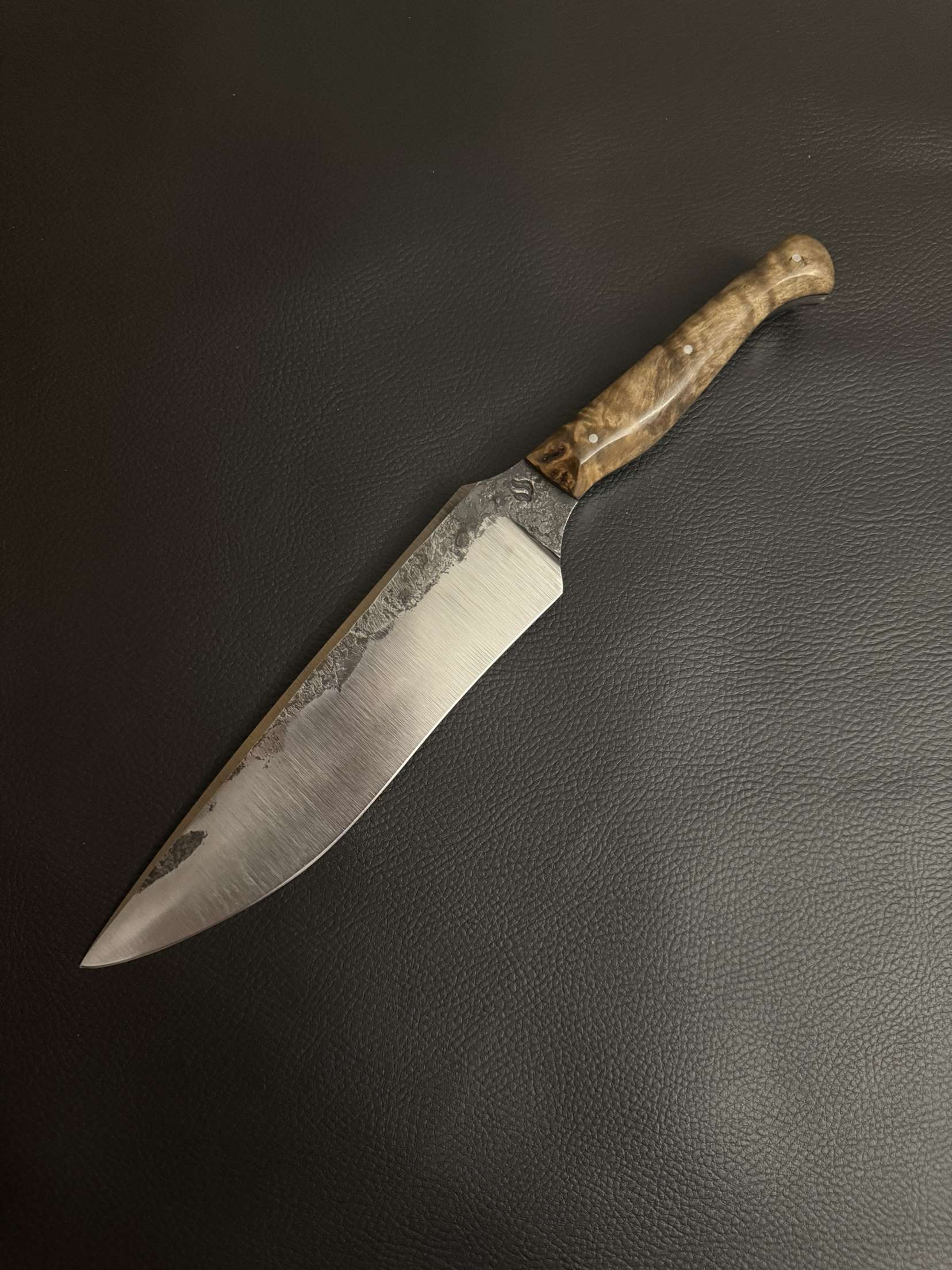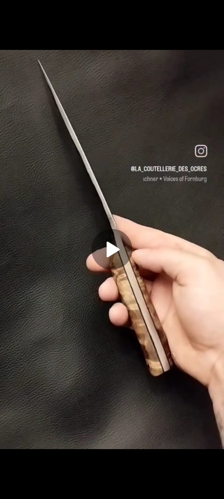 Ce manche, taillé dans une somptueuse loupe de noyer stabilisé (Raffir), dévoile des veinures profondes et changeantes, presque vivantes, comme si le bois gardait la mémoire de l’arbre d’où il provient. Chaque reflet, chaque nuance, raconte une histoire unique.