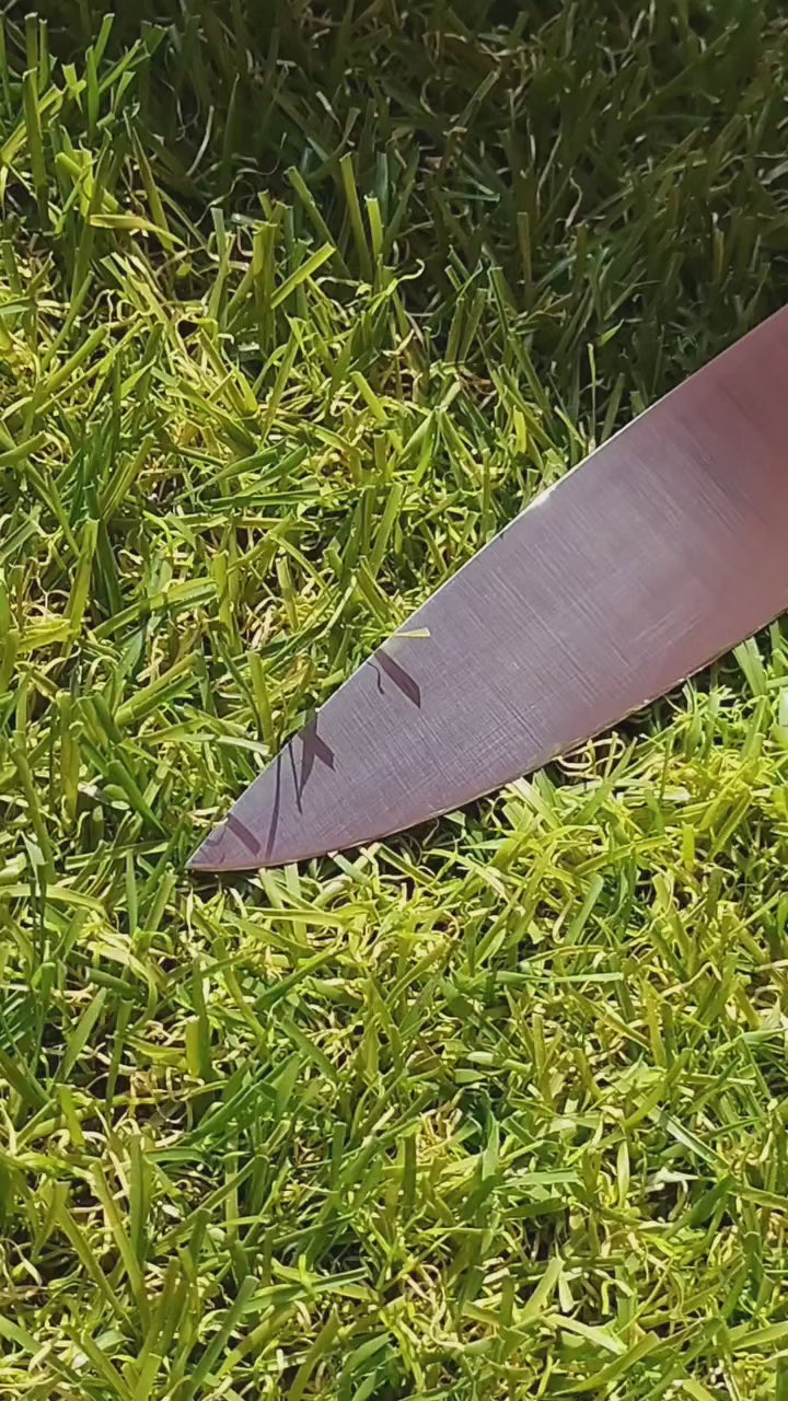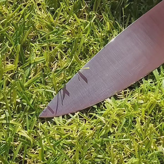 Couteau artisanal forgé avec une lame en acier carbone XC75, réputé pour sa finesse de coupe, sa facilité d’affûtage et son caractère authentique.